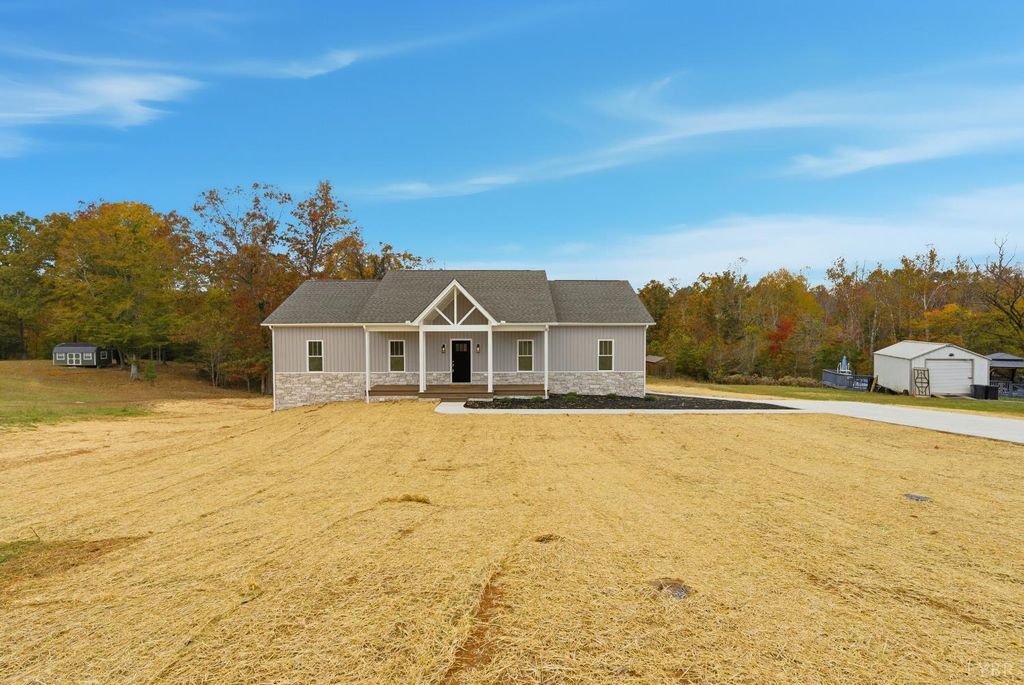 No builder grade here! Stunning New Construction Home on almost 1.50 Acres tucked away in the Elon Forest community and just minutes to the James River. This showstopper is a 3-Bedroom, 2-Bath home featuring an exquisite 27X8 rocking chair front porch with composite deck detailed A frame, neutral colored board and batten vinyl, beautiful columns that will warmly welcome you and your guest's home. Notable features include energy efficient HVAC, luxury vinyl plank floors, upgraded quartz, upgraded soft close cabinetry, stone fireplace, all stainless-steel appliances including refrigerator, tiled primary bath, upgraded lighting, oversized laundry room with plenty of storage and room for a future drop zone, and other carefully crafted details. The unfinished basement is plumbed for a future bathroom and has lots of potential to grow! Enjoy the spacious back deck for gatherings while you look out over your large level backyard. This one is a hit so don't miss it!