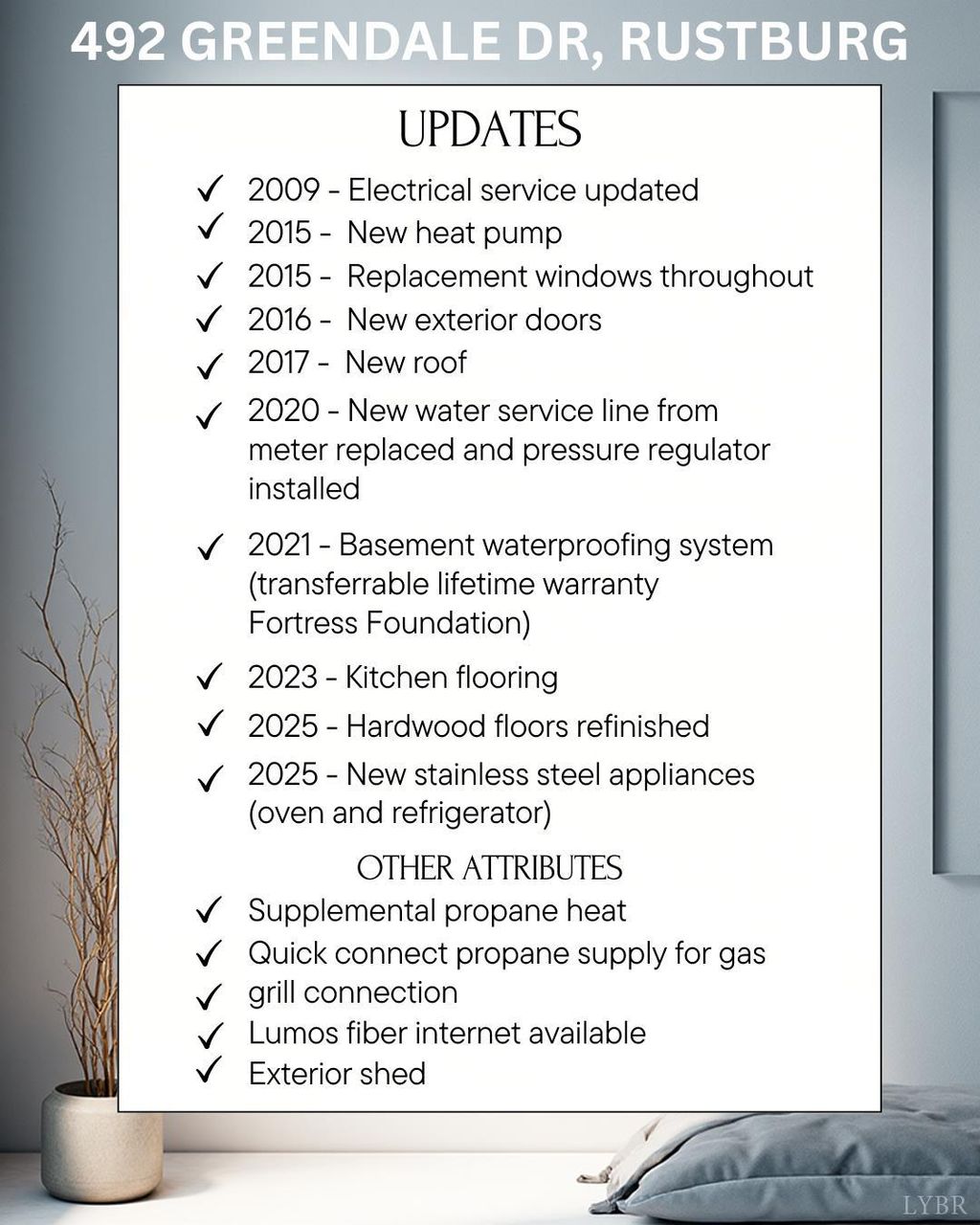 Welcome to 492 Greendale Dr (Brookville School District), a lovingly maintained brick home that blends timeless character with smart, modern updates. Major improvements include a newer roof, efficient heat pump, replacement windows, updated electrical service, new exterior doors, and a recently replaced water service line. Inside, enjoy fresh kitchen flooring, beautifully refinished hardwoods, and new stainless-steel appliances that give the home a crisp, refreshed feel. A professionally installed basement waterproofing system with a transferable lifetime warranty through Fortress Foundation adds extra peace of mind. Step outside to a spacious lot with quick-connect propane for grilling, supplemental propane heat options, Lumos fiber availability, and a convenient exterior shed. With meaningful upgrades from top to bottom and easy access to nearby shopping, dining, and Liberty University (use as off campus student housing), this home is ready to welcome its next owner.