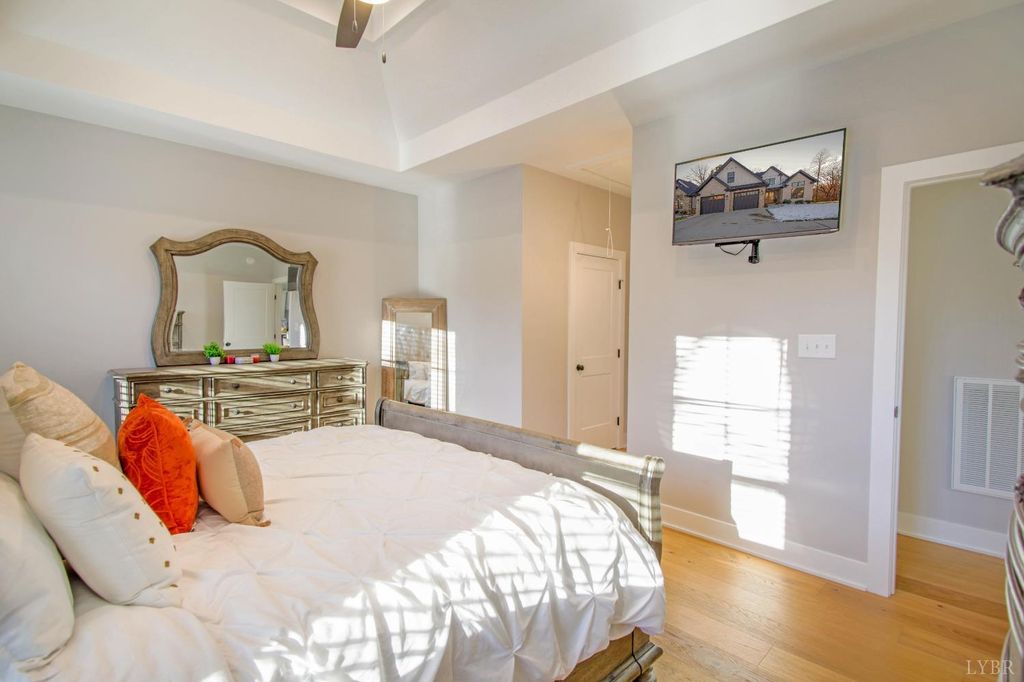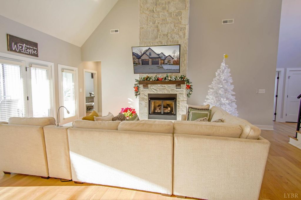 New construction in one of Lynchburg's newest upscale communities. The home offers true main level living & a seamless open concept floor plan. The chef's kitchen includes a double-oven range, quartz countertops, marble subway tile backsplash, pantry, and a large island- perfect for entertaining. The main-level primary suite features dual walk-in closets and a spa-inspired bathroom. Two additional main-level bedrooms, a full bath, hardwood flooring throughout the main level and a dedicated laundry room provide comfort & functionality. Upstairs you will find 2 large bedrooms, a full bath & storage room. Other features include A stacked stone gas log fireplace, covered back patio, mountain views, & minutes to shopping centers , Liberty University, wards rd, route 460 & so much more. Schedule your appointment to see this now!