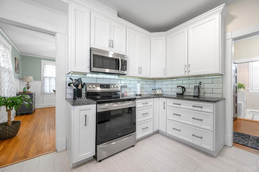 Nestled in the heart of Bedford, this charming Victorian farmhouse blends timeless character with thoughtful modern updates. The main level offers an inviting, well-designed layout where the dining room gracefully connects the living room and kitchen, showcasing classic wainscoting and a built-in buffet that adds both charm and function. The beautifully remodeled kitchen (2025) shines with under-cabinet lighting, abundant storage, and stainless steel appliances, making it ideal for everyday living and entertaining. Upstairs, you'll find four generously sized bedrooms and updated bathrooms, including a serene owner's suite complete with a private deck and peaceful views of the Peaks. Recent major upgrades include a new roof (2025) and a new heat pump serving the upper level. Set on 0.55 acres, the property offers a spacious backyard, fenced front yard, storage building, and plenty of parking. Move-in ready and ideally located, this home is ready to welcome it's next chapter.