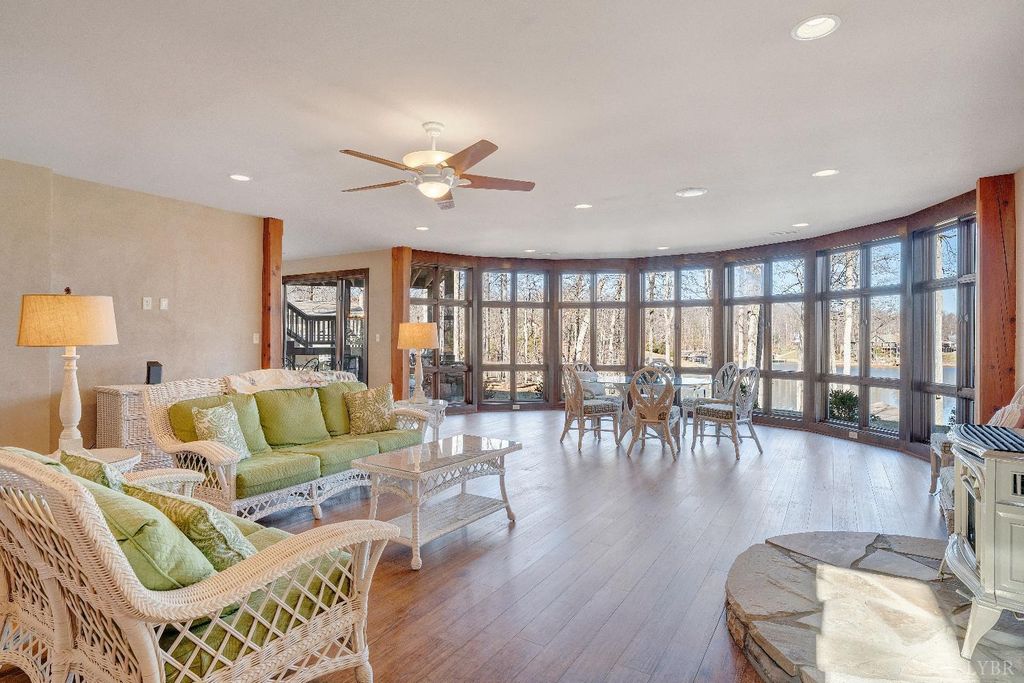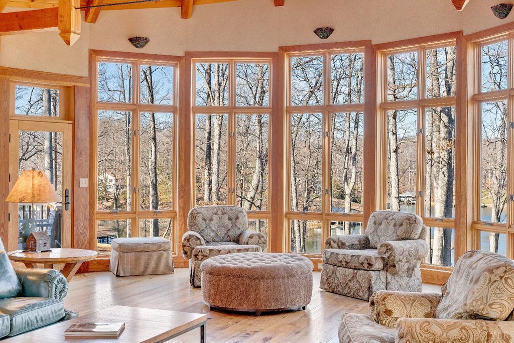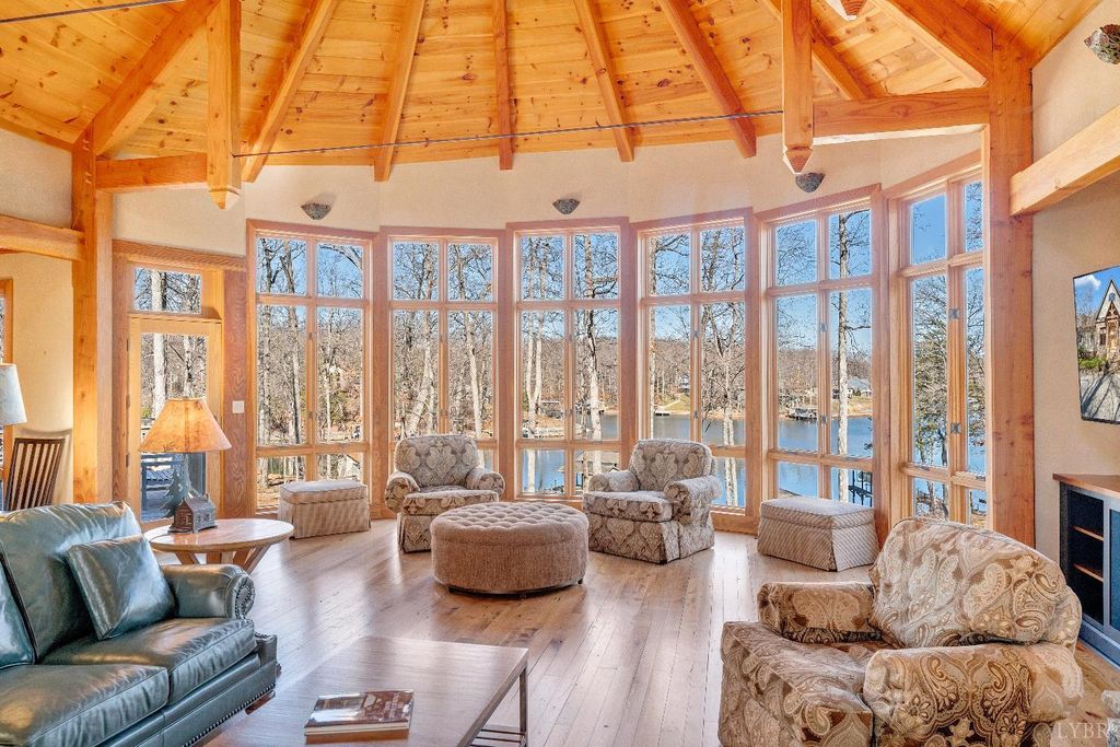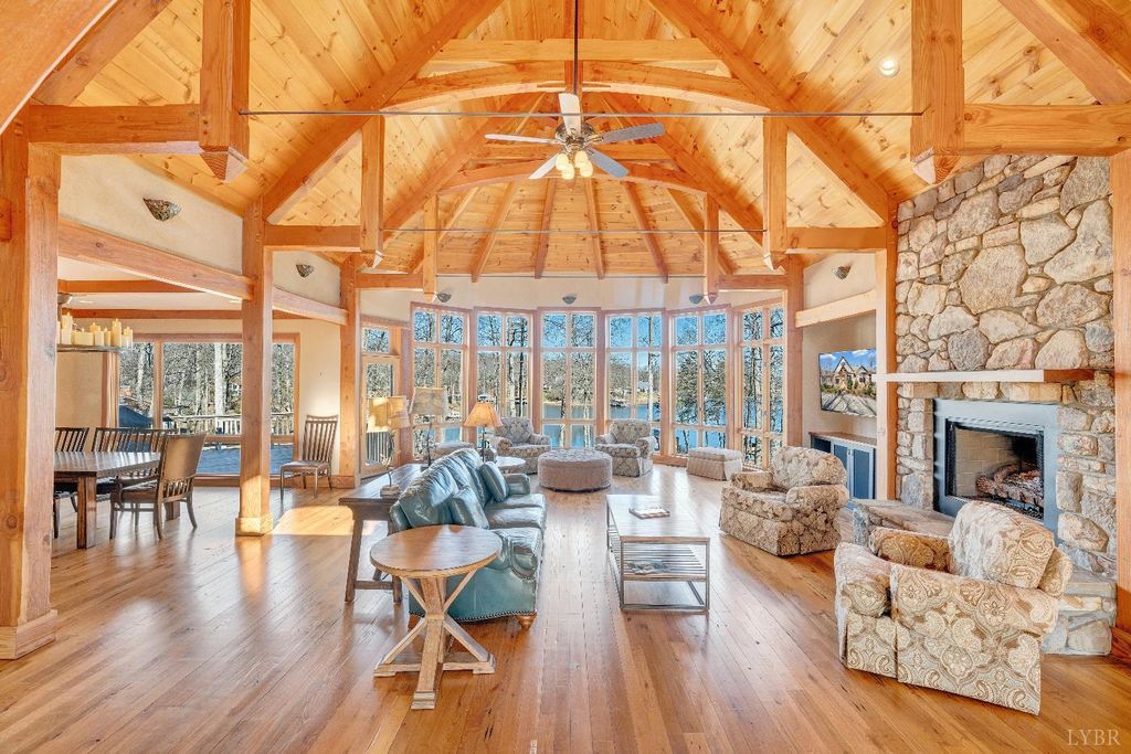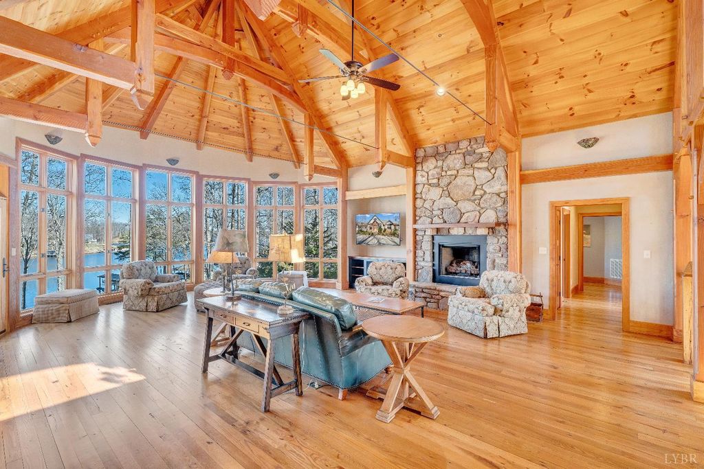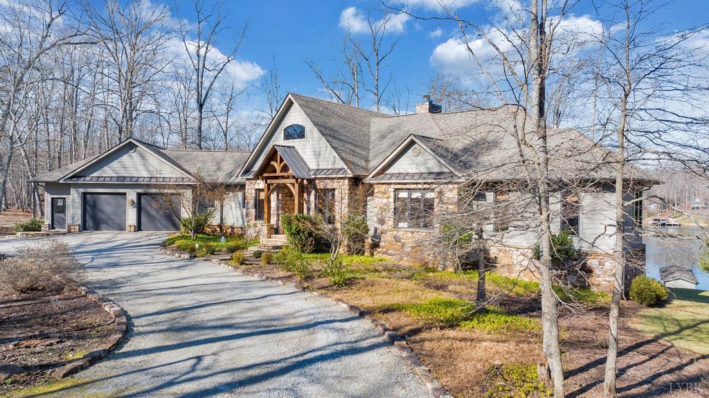 Welcome to 104 Arbor Lane, a custom-built waterfront retreat at Smith Mountain Lake designed for memorable gatherings and peaceful escapes. Completed in 2010, this 4,500+ sq ft home offers panoramic lake views, timeless craftsmanship, and refined finishes throughout. The Hardiplank and stone exterior, oversized garage, and landscaped setting create striking curb appeal. Inside, a timber-frame great room with soaring ceilings and a stone fireplace anchors the open layout. The chef's kitchen features Sub-Zero, Wolf, and Bosch appliances, soapstone counters, a copper wet bar, wine cooler, and ice-maker. A cedar screened-in porch with fireplace blends indoor and outdoor living. The primary suite offers lake views and a spa-like bath. The terrace level includes additional bedrooms, a bunk room, and second living area. Notable upgrades include geothermal HVAC, radiant heat, whole-house generator, and a dock with covered slip and lift, delivering exceptional lake living.