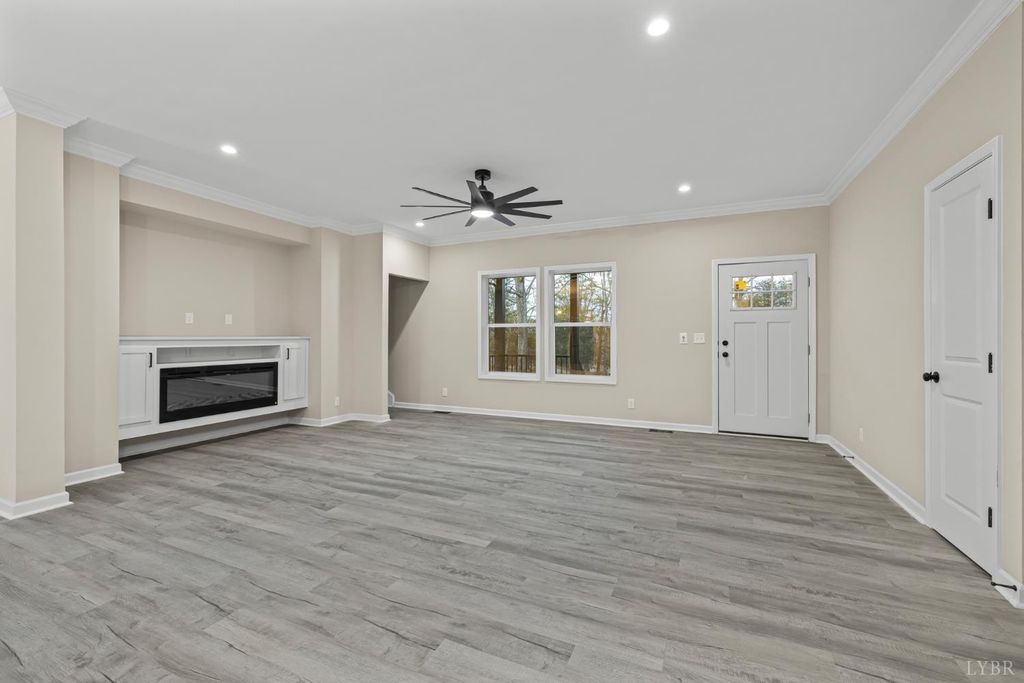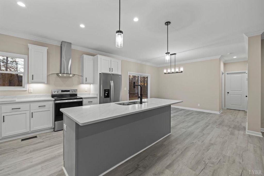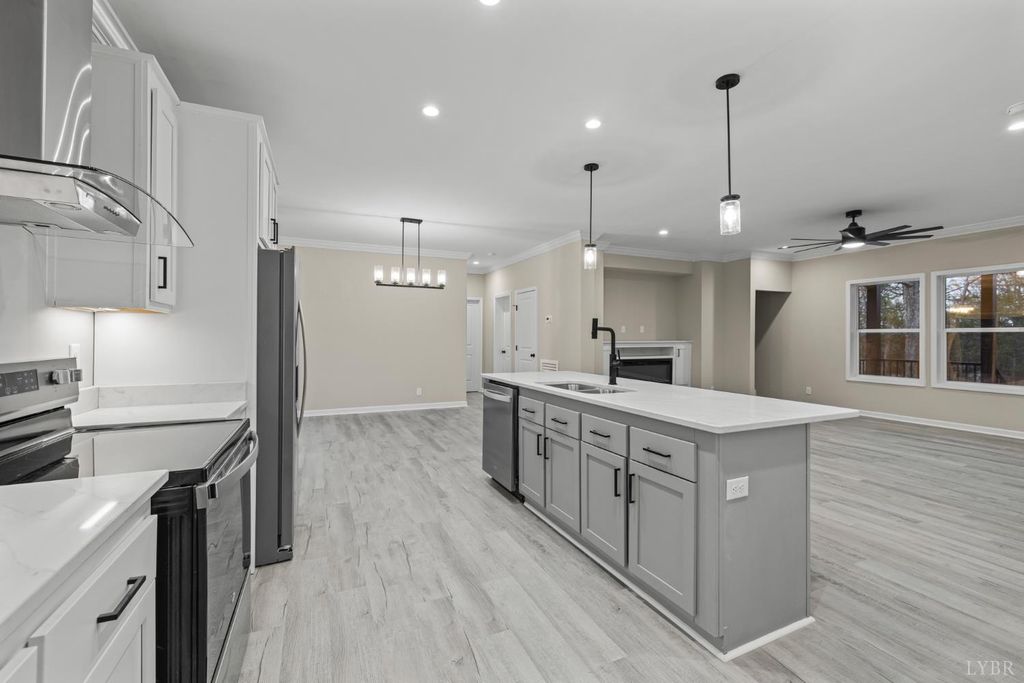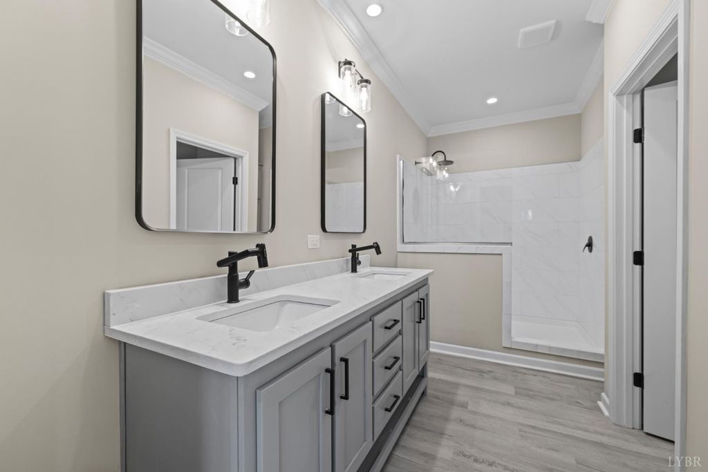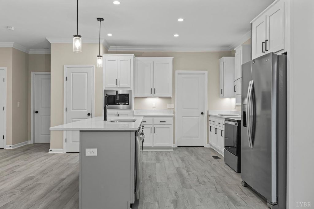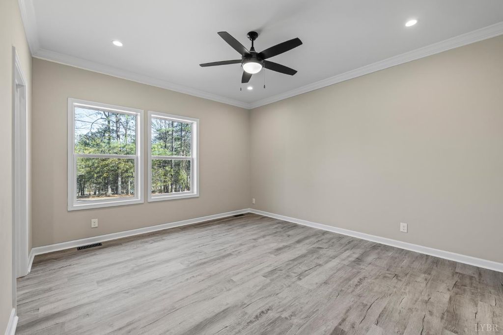 200 Saunders Point Road. NO HOA, Road Maintenance agreement is only $100/year. Enjoy lake views at Smith Mountain Lake in this 3BR/3BA custom home. The main level offers 1,800 sq ft, with an additional 920 sq ft upstairs featuring a full bath, storage, and a 16' x 60' family/theater space. Features include a concrete driveway with boat parking, composite decks, black windows, solid-core doors, hidden pantry, LVP flooring, and quartz countertops. Built with 2x6 exterior walls, dual-zone heat pumps, and a 9/12 pitch roof.
