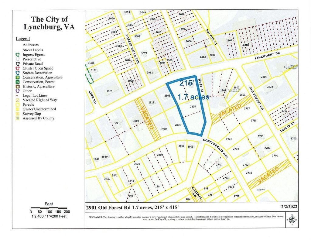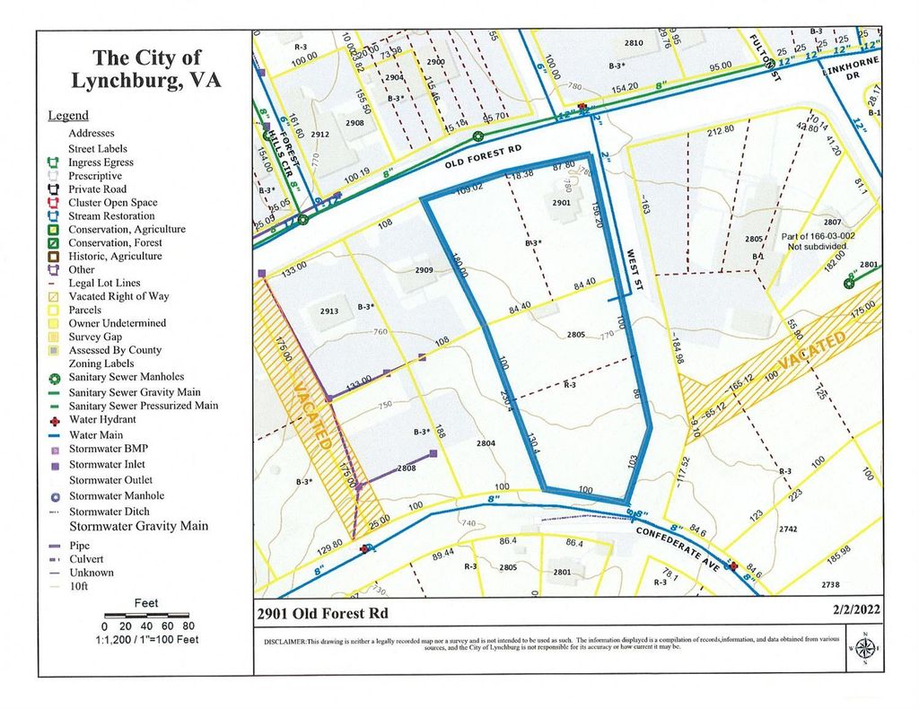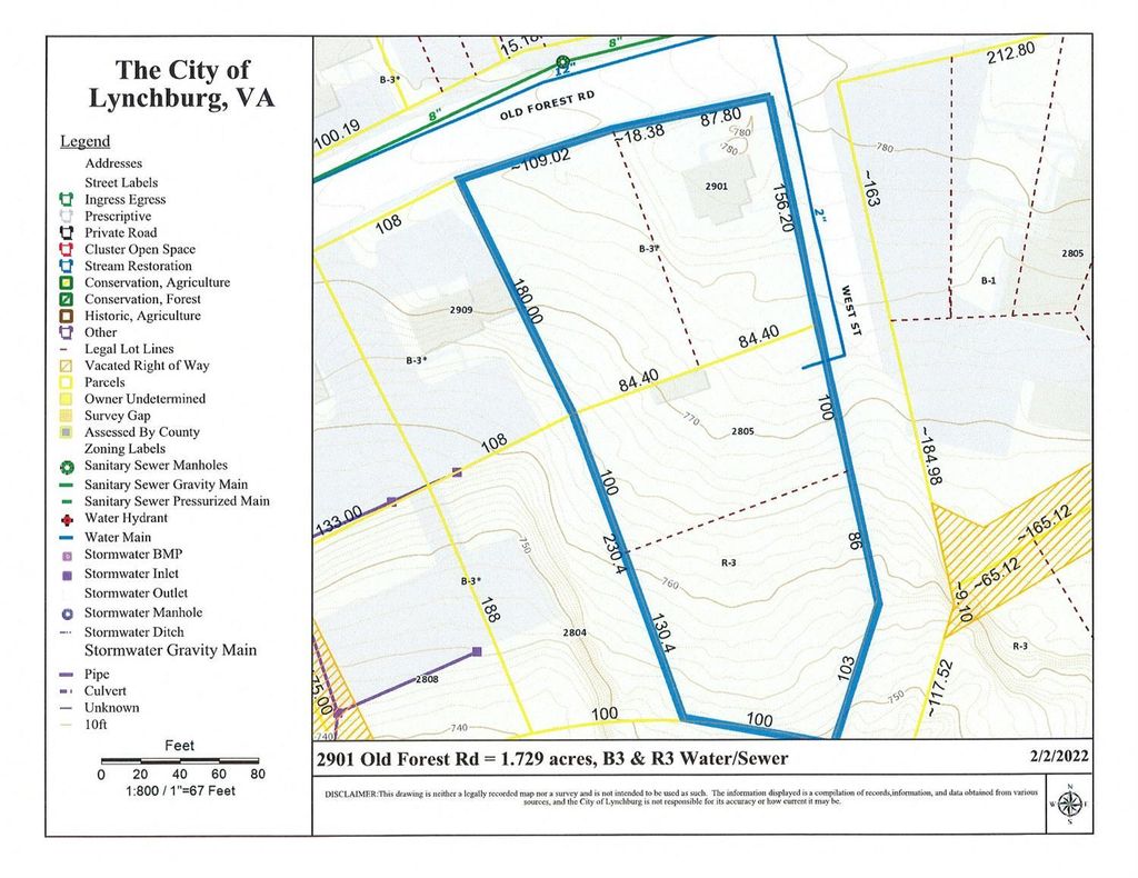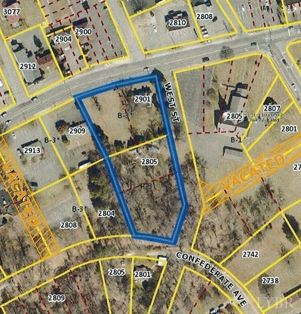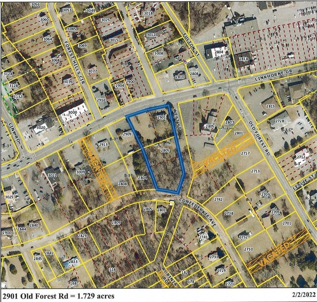 Corner lot across from Papa Johns with 215 ft. frontage on Old Forest Road, plus 445 ft. frontage on West Street, plus 100 ft. on Confederate Ave. Water and Sewer available. Zoned B-3 & R-3. Excellent site for strip center, restaurant, C-store or professional offices. Existing house is currently rented as residential, but could be used for office.