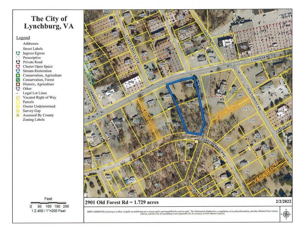 Corner lot across from Papa Johns with 215 ft. frontage on Old Forest Road, plus 445 ft. frontage on West Street, plus 100 ft. on Confederate Ave. Water and Sewer available. Zoned B-3 & R-3. Excellent site for strip center, restaurant, C-store or professional offices. Existing house is currently rented as residential, but could be used for office.