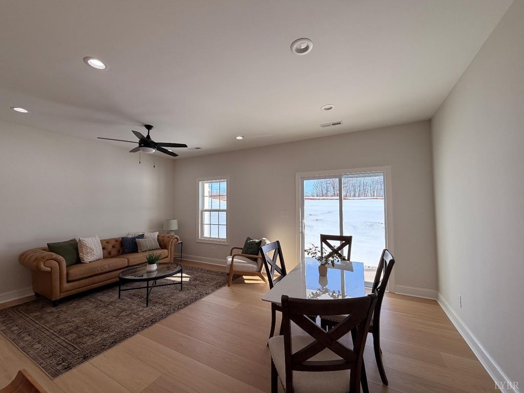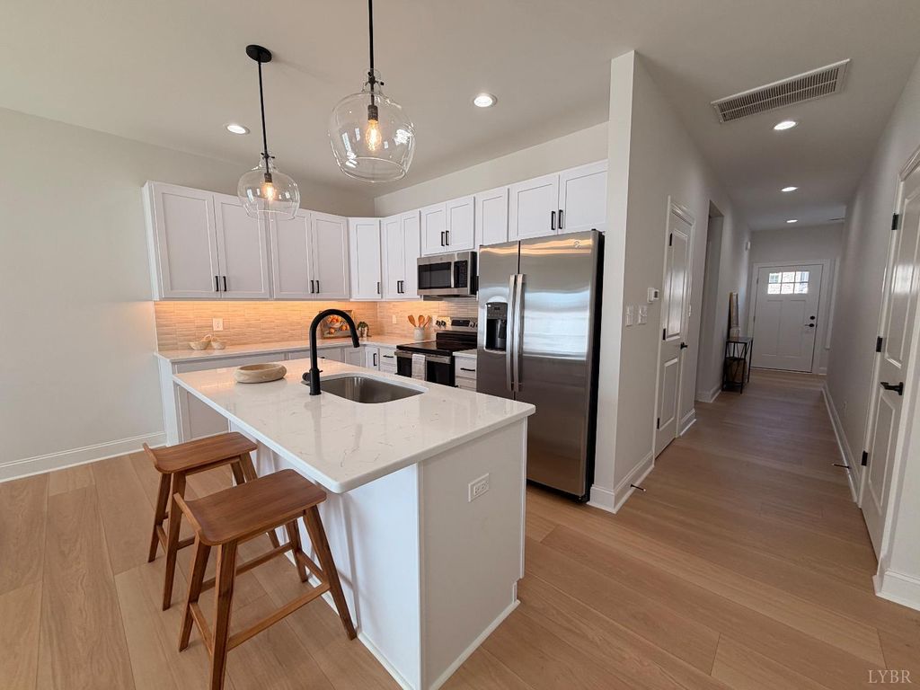 Spacious 4BR/3BA townhome just off Leesville Rd, minutes to Liberty University, area colleges, Wards Rd, shopping, and dining. Community allows short-term (Airbnb/VRBO), mid-term, and long-term rentalsideal for investors or owner-occupants. Open-concept main level features a custom kitchen with quartz countertops, tile backsplash, large island, stainless appliances (refrigerator included), and ample cabinetry. Bright living and dining areas plus a main-level bedroom and full bath. Upstairs offers a vaulted primary suite with oversized walk-in closet and private bath, two additional bedrooms, full hall bath, and laundry room with washer and dryer included. Luxury vinyl plank flooring, upgraded insulation, modern finishes, and generous storage throughout. Built by Sundance Design Build with a 1-year systems warranty and 10-year structural warranty backed by Liberty Mutual/Quality Builders Warranty.